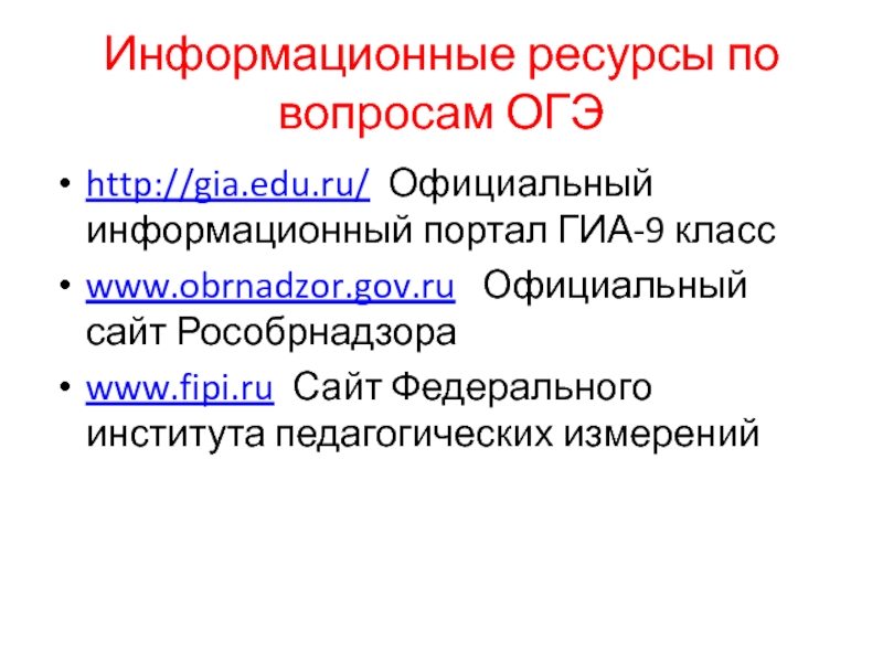 Информационные ресурсы по вопросам ОГЭhttp://gia.edu.ru/ Официальный информационный портал ГИА-9 класс www.obrnadzor.gov.ru  Официальный сайт Рособрнадзораwww.fipi.ru Сайт Федерального