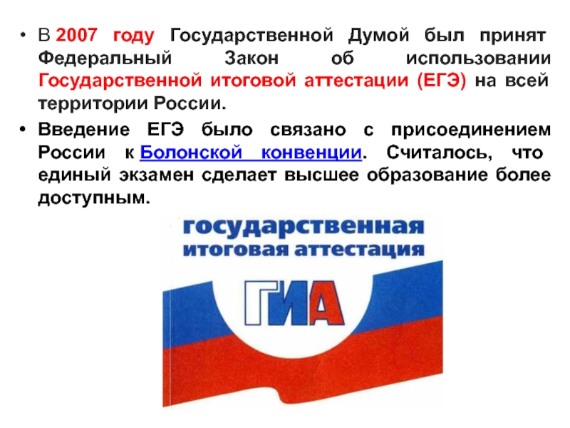 В 2007 году Государственной Думой был принят Федеральный Закон об использовании Государственной итоговой аттестации (ЕГЭ) на всей территории