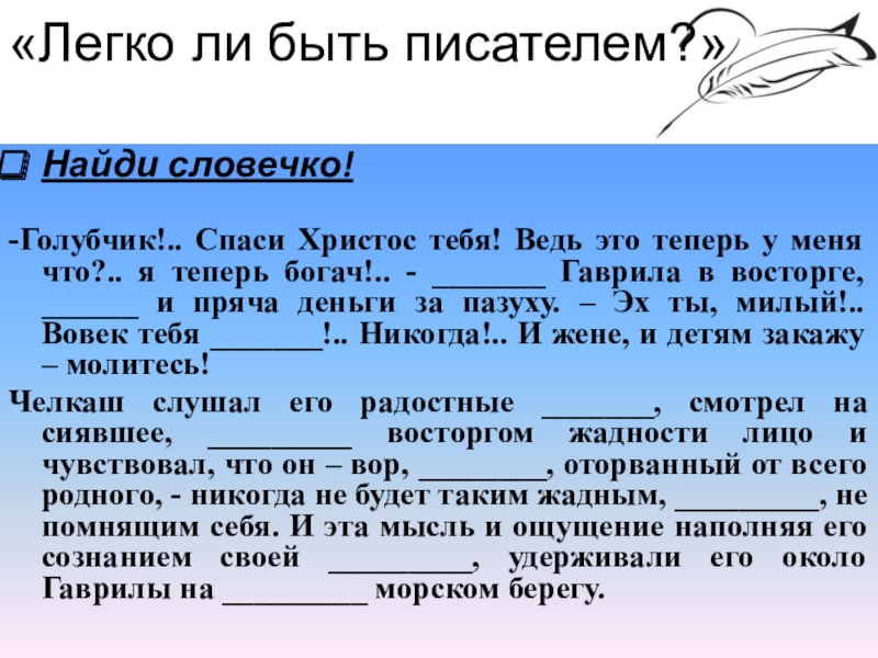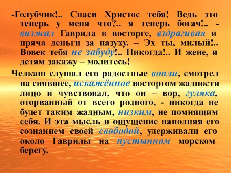 Челкаш слушал его радостные _______, смотрел на сиявшее, _________ восторгом жадности лицо и чувствовал, что он – вор, ________, оторванный от всего родного, - никогда не будет таким жадным, _________, не помнящим себя. И эта мысль и ощущение наполняя его сознанием своей _________, удерживали его около Гаврилы на _________ морском берегу.