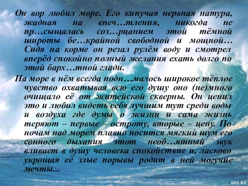 На море в нём всегда подн…малось широкое тёплое чувство охватывая всю его душу оно (не)много очищало её от житейской скверны. Он ценил это и любил видеть себя лучшим тут среди воды и воздуха где думы о жизни и сама жизнь теряют – первые – остроту, вторые – цену. По ночам над морем плавно носится мягкий шум его сонного дыхания этот необ…ятный звук вливает в душу человека спокойствие и, ласково укрощая её злые порывы родит в ней могучие мечты...