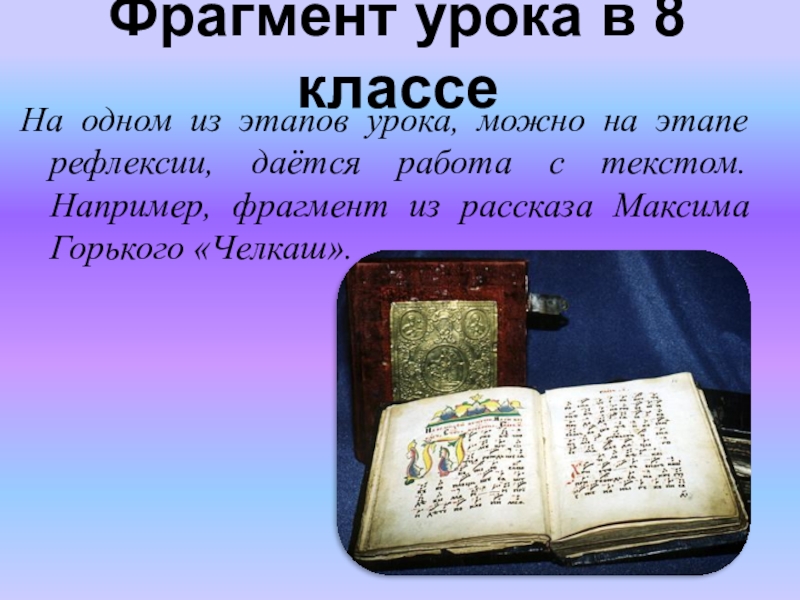 этапе рефлексии, даётся работа с текстом. Например, фрагмент из рассказа Максима Горького «Челкаш».