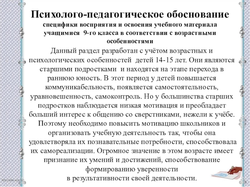 Данный раздел разработан с учётом возрастных и психологических особенностей детей 14-15 лет. Они являются старшими подростками и находятся на этапе перехода в раннюю юность. В этот период у детей повышается коммуникабельность, появляется самостоятельность, уравновешенность, самоконтроль. Но у большинства старших подростков наблюдается низкая мотивация и преобладает больший интерес к общению со сверстниками, нежели к учёбе. Поэтому необходимо повысить мотивацию школьников и организовать учебную деятельность так, чтобы она удовлетворяла их познавательные потребности, способствовала их самореализации. Огромное значение в этом возрасте имеет признание их умений и достижений, способствование формированию уверенности