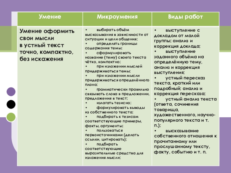 Умение оформить свои мысли в устный текст точно, компактно, без искажения