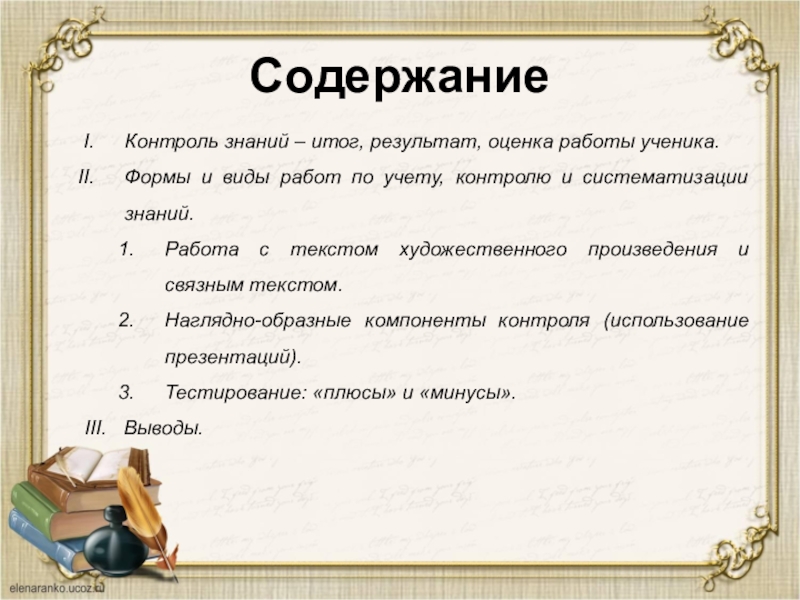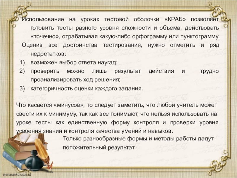 Что касается «минусов», то следует заметить, что любой учитель может свести их к минимуму, так как все понимают, что нельзя использовать на уроке тесты как единственную форму контроля и проверки уровня усвоения знаний и контроля качества умений и навыков.