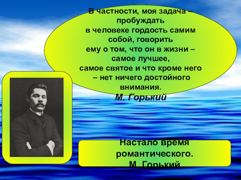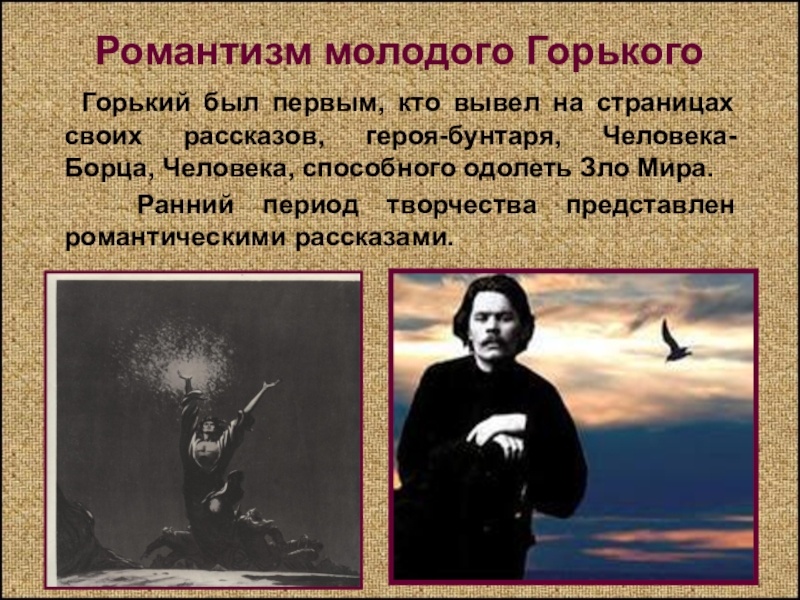 Горький выступил с гимном прекрасному и сильному человеку. Стремление к подвигу, поклонение силе, прославление свободы.