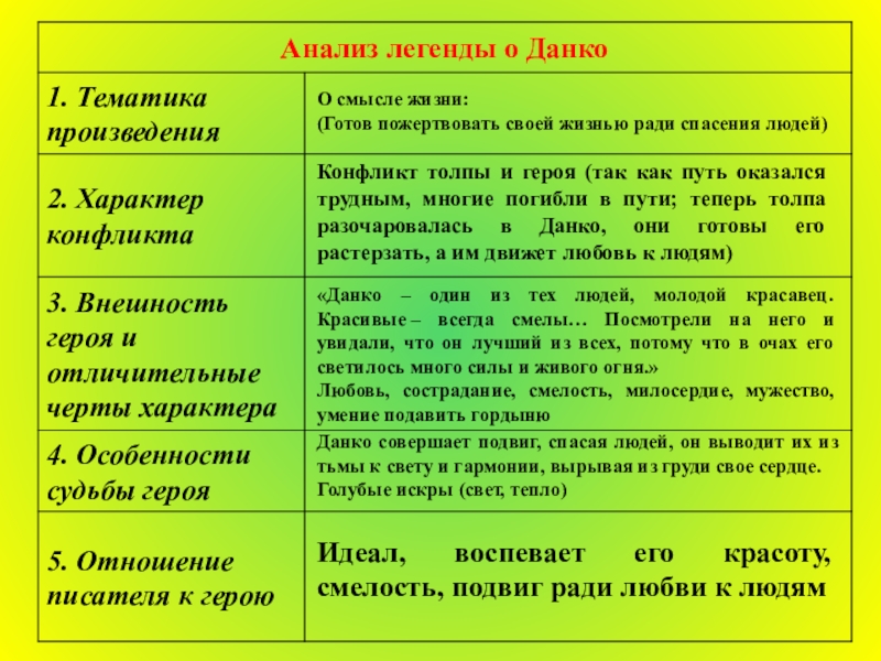 Данко совершает подвиг, спасая людей, он выводит их из тьмы к свету и гармонии, вырывая из груди свое сердце.