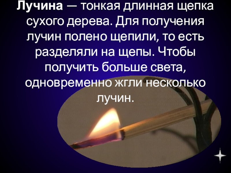 Слайд 5Лучи́на — тонкая длинная щепка сухого дерева. Для получения лучин полено щепили, то есть разделяли