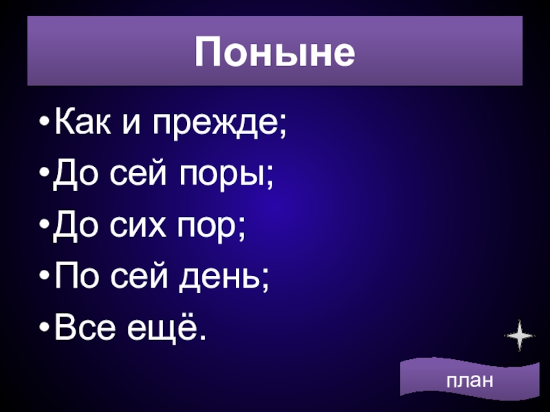 Поныне Как и прежде;До сей поры;До сих пор;По сей день;Все ещё.план