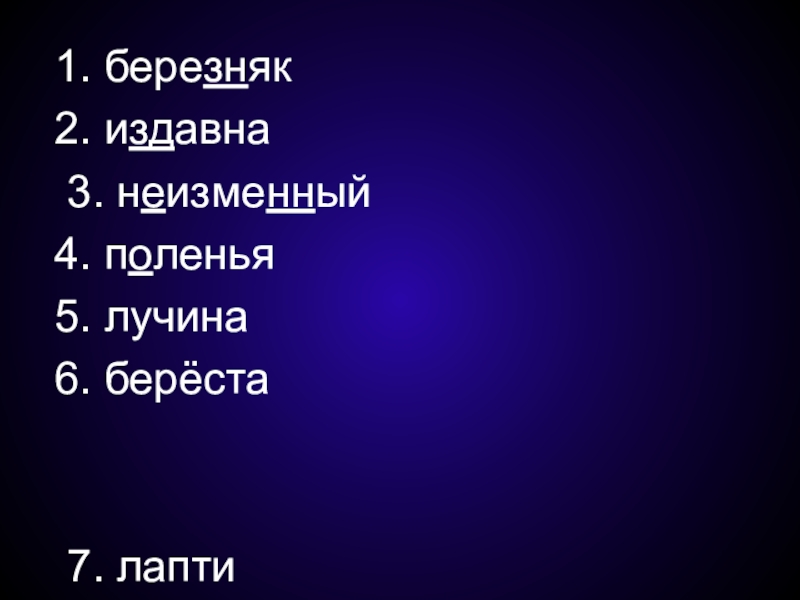 1. березняк2. издавна 3. неизменный4. поленья5. лучина6. берёста 7. лапти 8. розги 9. некопаный колодец 10. черпать