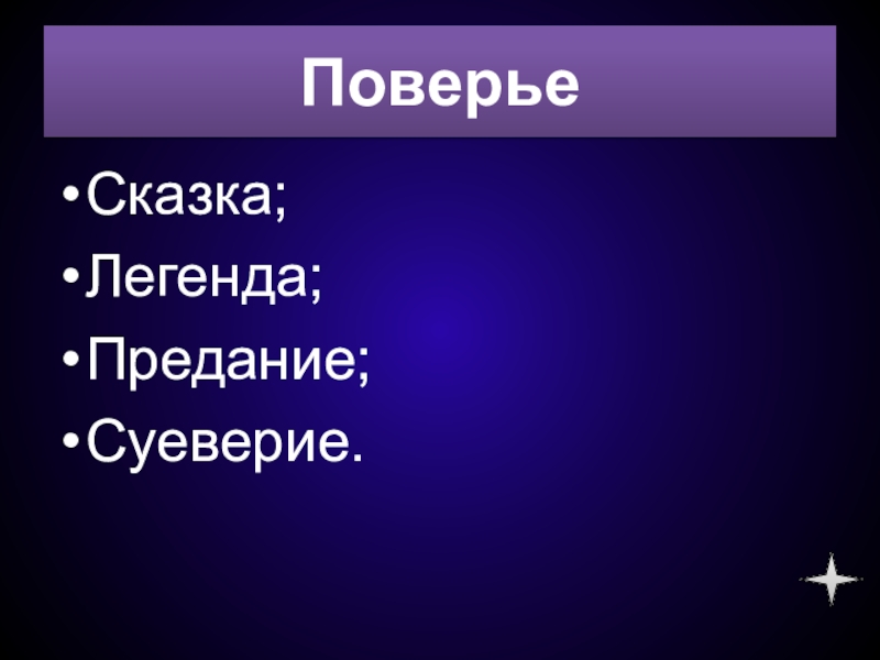 Поверье Сказка;Легенда;Предание;Суеверие.