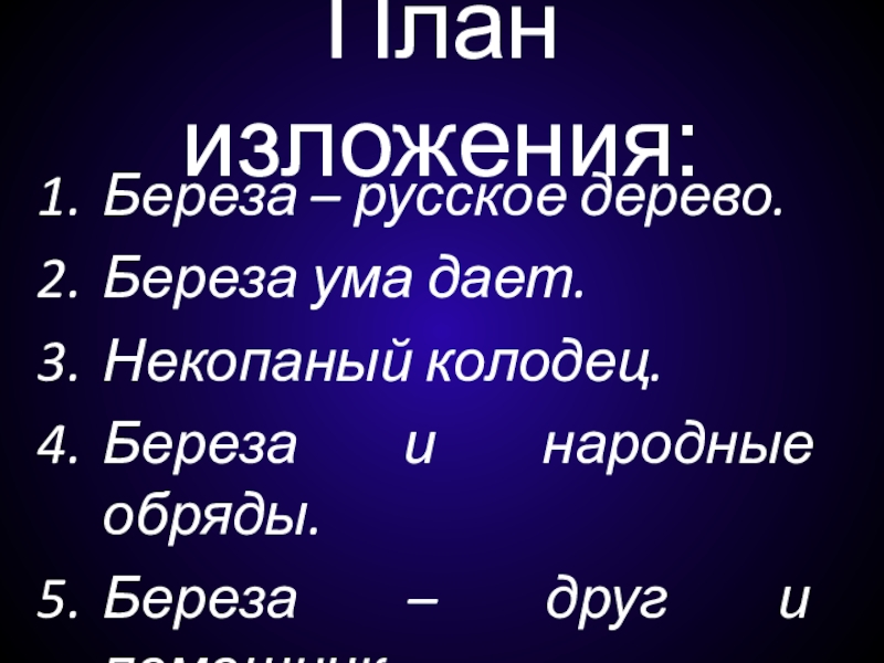 План изложения:Береза – русское дерево.Береза ума дает.Некопаный колодец.Береза и народные обряды.Береза – друг и помощник.