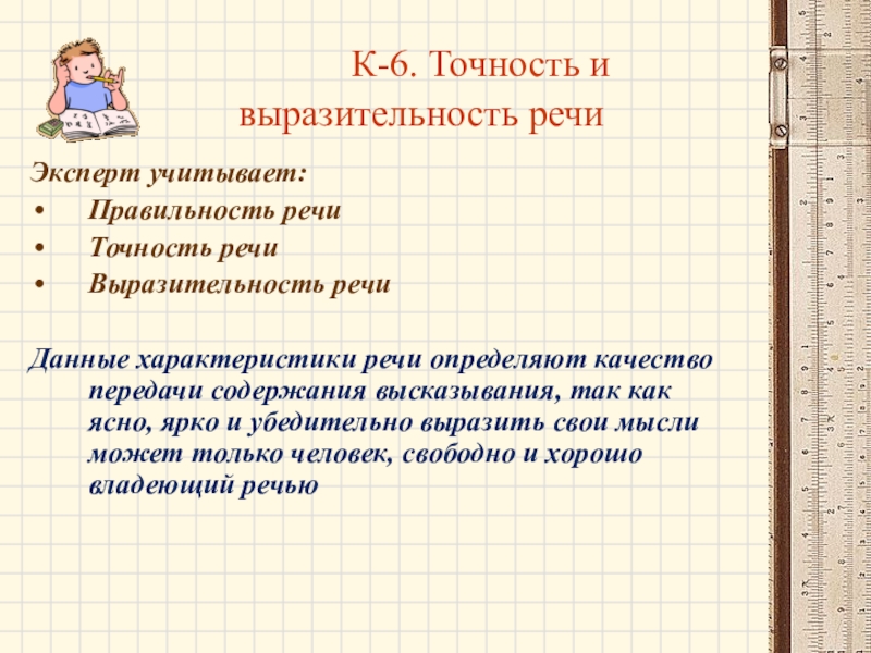 Данные характеристики речи определяют качество передачи содержания высказывания, так как ясно, ярко и убедительно выразить свои мысли может только человек, свободно и хорошо владеющий речью