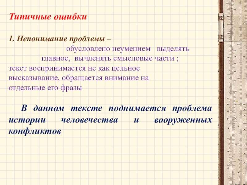 игнорирование учащимся ключевых слов (нет четкого представления о смысле текста, теряются границы конкретной проблемы)