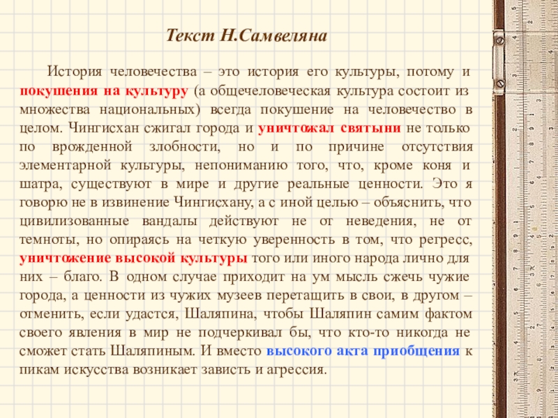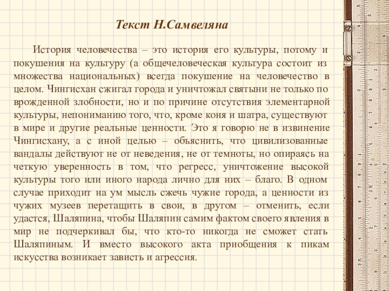 Проблема текста в том, что история человечества – это история его культуры. А Чингисхан сжигал города и уничтожал святыни, так как сам был бескультурным человеком.