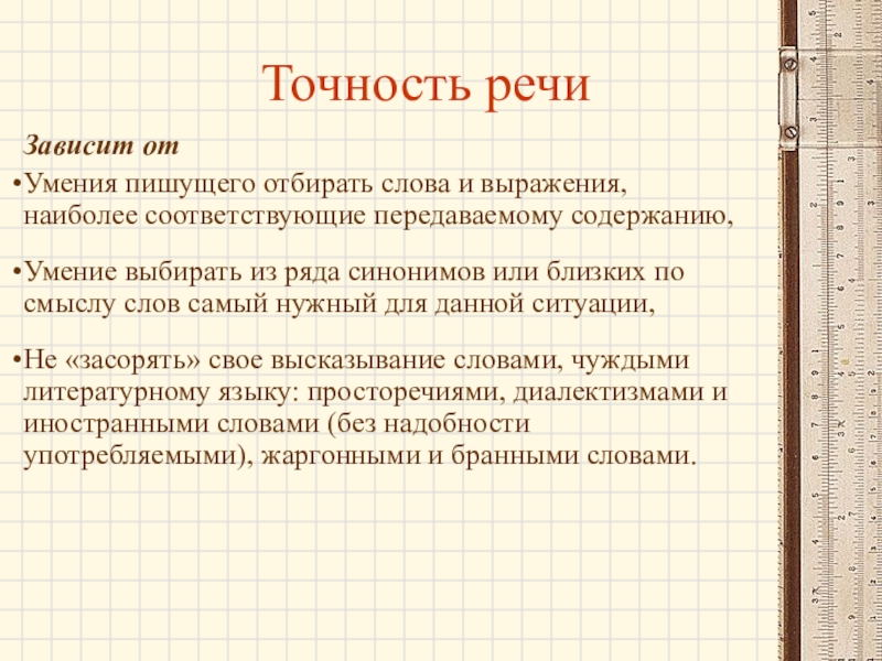 Не «засорять» свое высказывание словами, чуждыми литературному языку: просторечиями, диалектизмами и иностранными словами (без надобности употребляемыми), жаргонными и бранными словами.