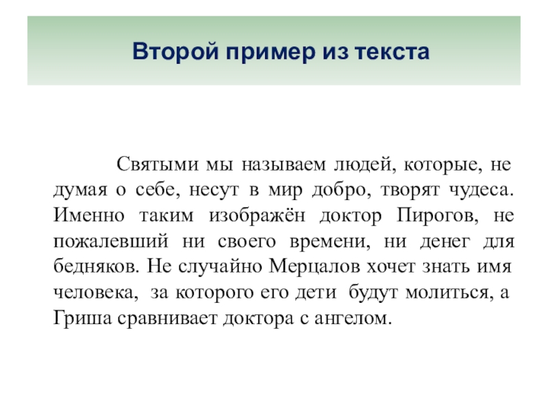 Святыми мы называем людей, которые, не думая о себе, несут в мир добро, творят чудеса. Именно таким изображён доктор Пирогов, не пожалевший ни своего времени, ни денег для бедняков. Не случайно Мерцалов хочет знать имя человека, за которого его дети будут молиться, а Гриша сравнивает доктора с ангелом.