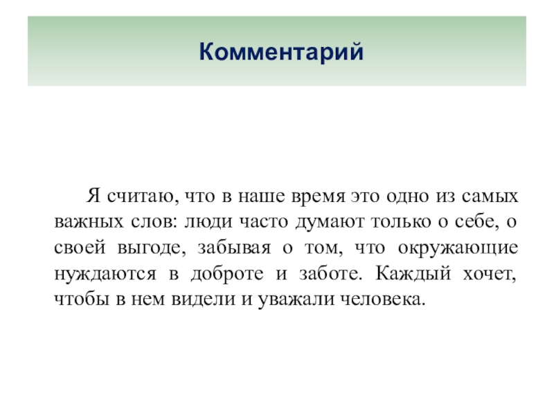 Я считаю, что в наше время это одно из самых важных слов: люди часто думают только о себе, о своей выгоде, забывая о том, что окружающие нуждаются в доброте и заботе. Каждый хочет, чтобы в нем видели и уважали человека.