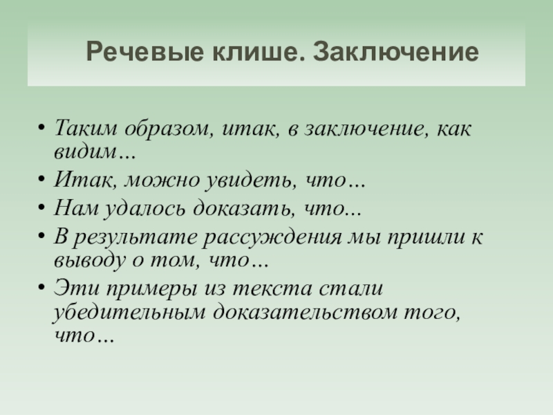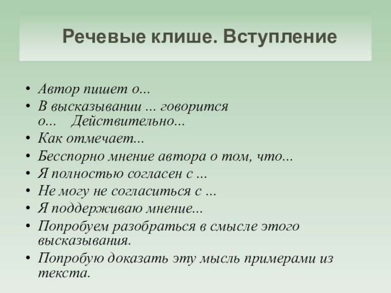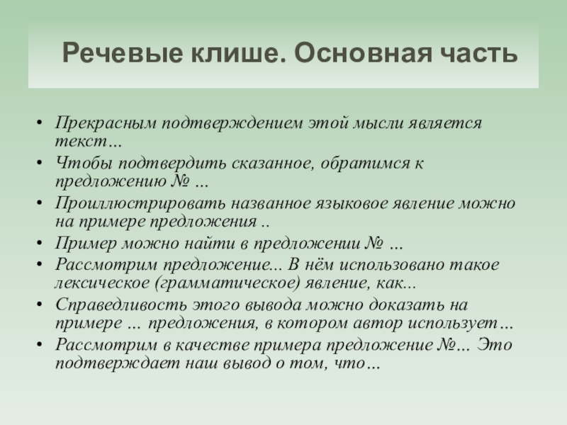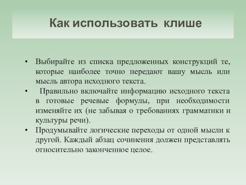 Правильно включайте информацию исходного текста в готовые речевые формулы, при необходимости изменяйте их (не забывая о требованиях грамматики и культуры речи).