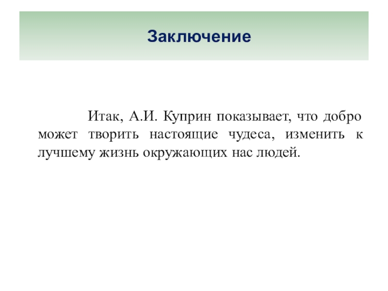 Итак, А.И. Куприн показывает, что добро может творить настоящие чудеса, изменить к лучшему жизнь окружающих нас людей.