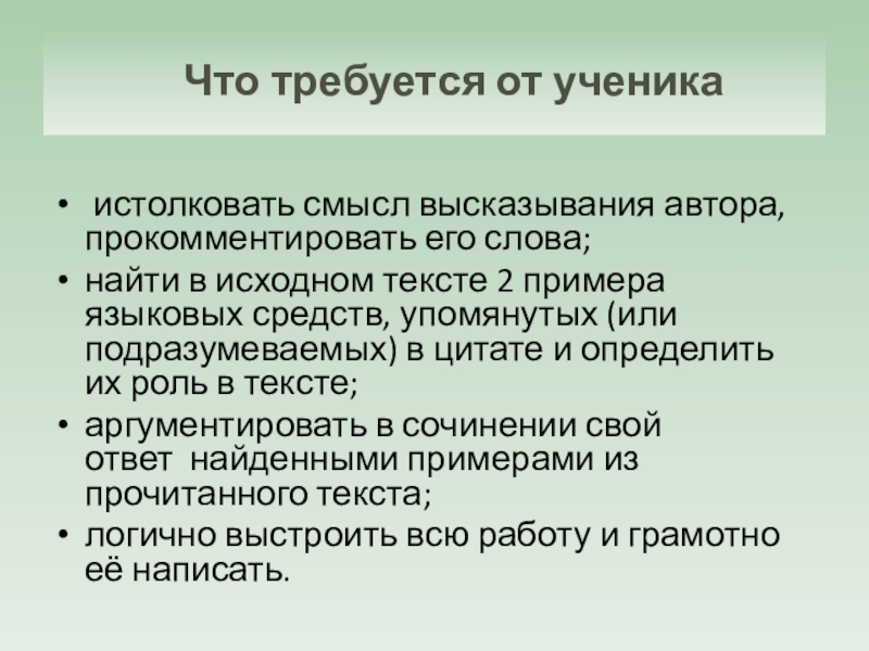 Работа, написанная без опоры на прочитанный текст (не по данному тексту), не оценивается. Если сочинение представляет собой пересказанный или полностью переписанный исходный текст без каких-либо комментариев, то такая работа оценивается нулём баллов.