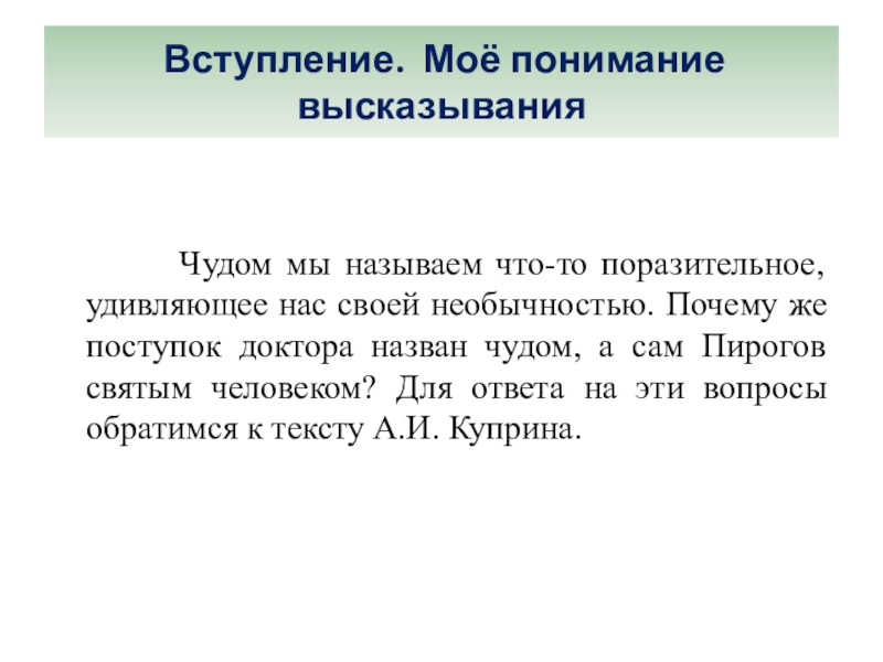 Чудом мы называем что-то поразительное, удивляющее нас своей необычностью. Почему же поступок доктора назван чудом, а сам Пирогов святым человеком? Для ответа на эти вопросы обратимся к тексту А.И. Куприна.