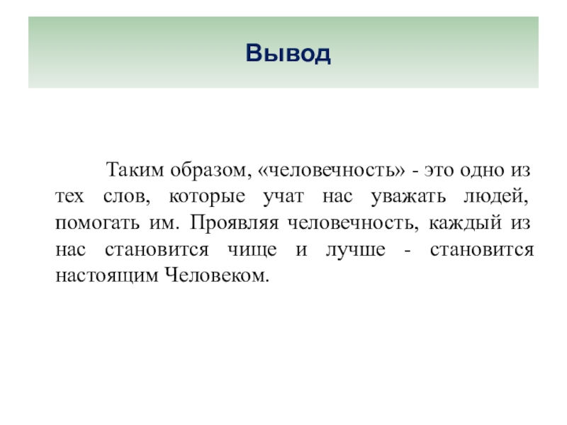 Таким образом, «человечность» - это одно из тех слов, которые учат нас уважать людей, помогать им. Проявляя человечность, каждый из нас становится чище и лучше - становится настоящим Человеком.