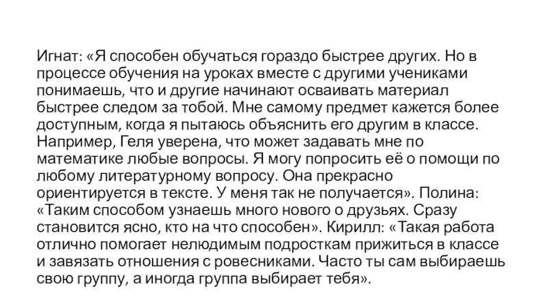 Слайд 6Игнат: «Я способен обучаться гораздо быстрее других. Но в процессе обучения
