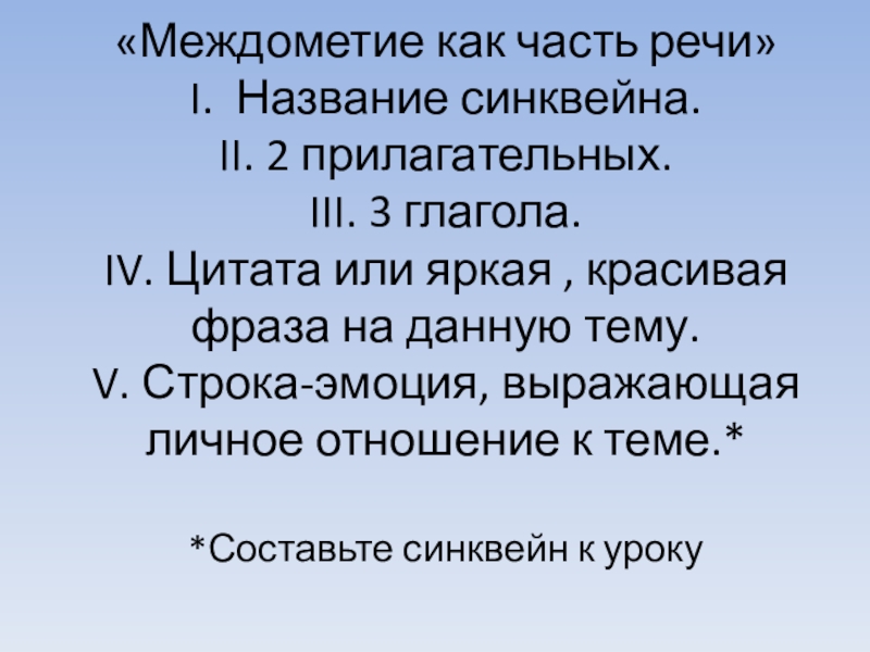 «Междометие как часть речи»  I. Название синквейна. II. 2 прилагательных. III. 3 глагола. IV. Цитата или