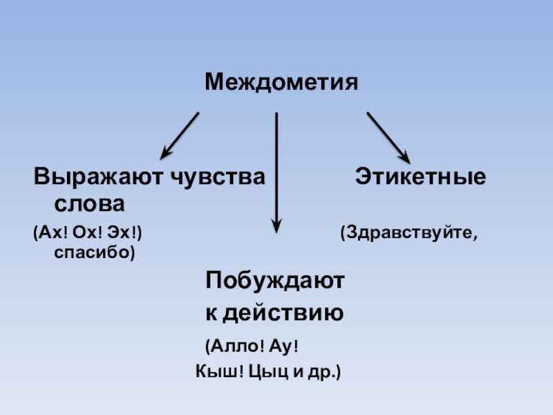 Междометия Выражают чувства        Этикетные слова(Ах! Ох! Эх!)