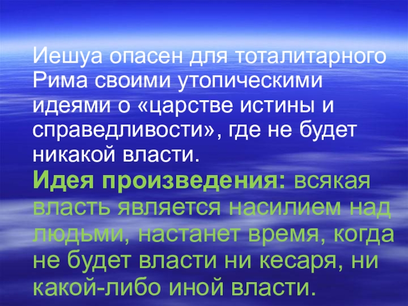 Слайд 10Иешуа опасен для тоталитарного Рима своими утопическими идеями о «царстве истины