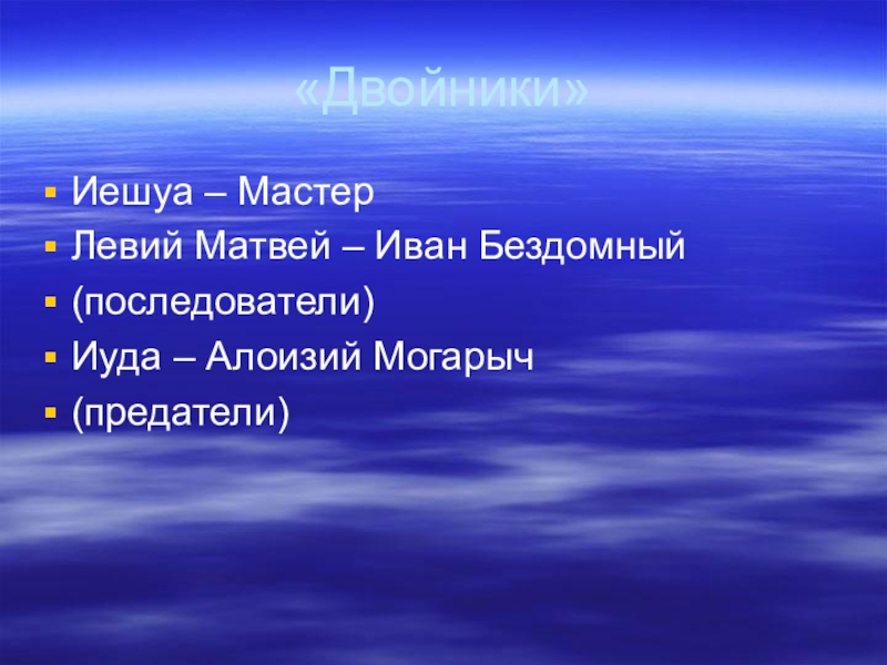 Иисус Христос. Иешуа выглядит абсолютно обычным человеком, способным испытывать страх перед физической расправой. Иешуа - бродячий философ, верящий, что каждый человек добр и что не будет на свете в скором времени никакой власти, кроме божьей. Безусловно, Иешуа обладает большой силой. Он вылечивает Пилата от головной боли. В Иешуа сосредоточены силы света, он погибает невинным, не соврав, не предав своих убеждений. За это он был достоин Света
