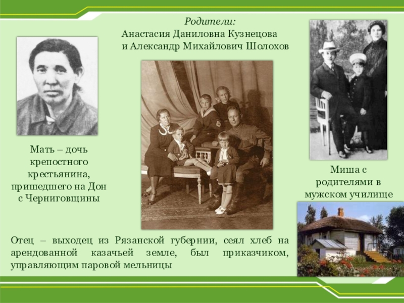 Отец – выходец из Рязанской губернии, сеял хлеб на арендованной казачьей земле, был приказчиком, управляющим паровой мельницы