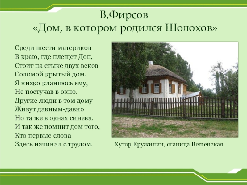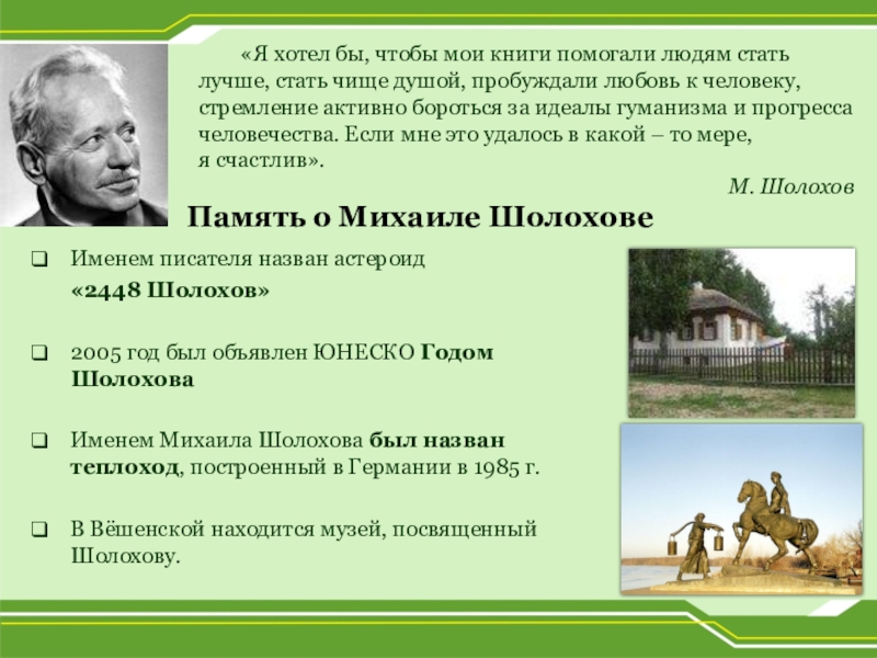«…Я назову дорогое всем нам имя Михаила Шолохова! В его произведениях мы видим алмазные россыпи русской речи. Не в словарях отысканное, не из запыленных фолиантов утащенное, а взятое писателем у самого хозяина языка – у народа – вот какое это слово!