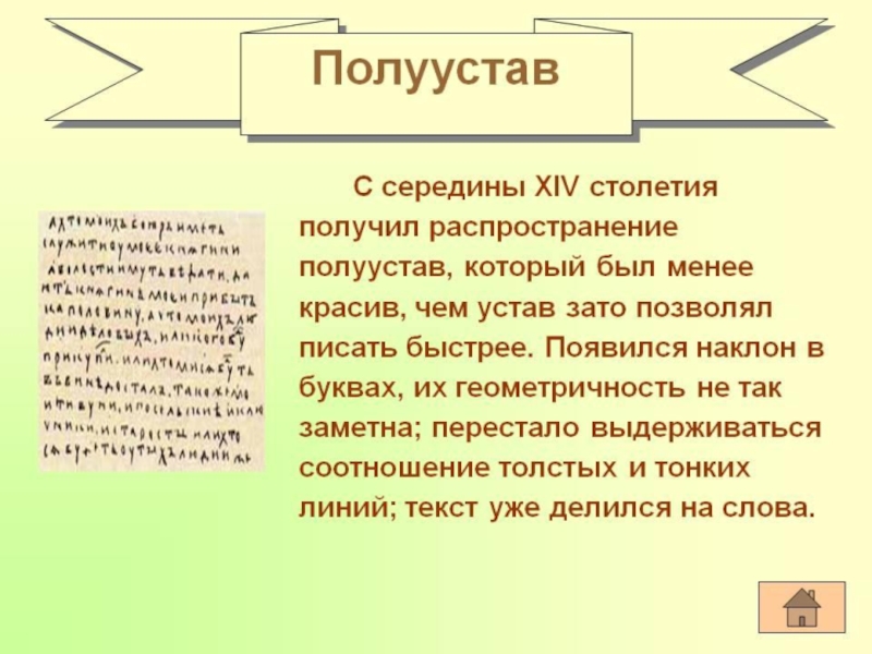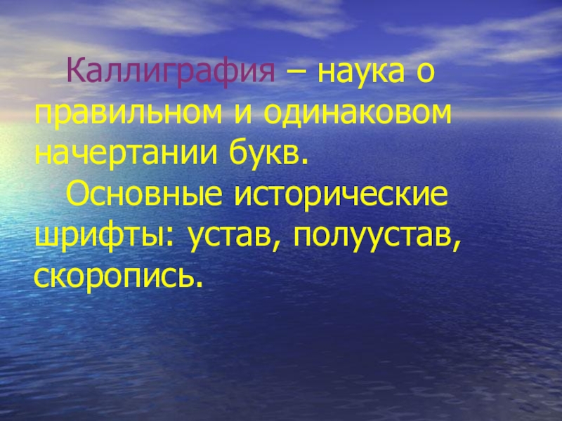 Каллиграфия – наука о правильном и одинаковом начертании букв.  Основные исторические шрифты: устав, полуустав,