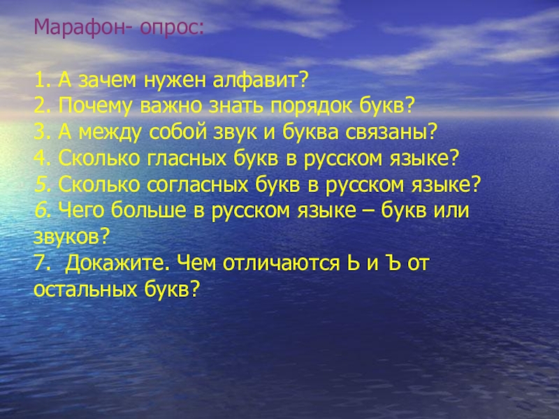 Слайд 23 Марафон- опрос: 1. А зачем нужен алфавит? 2. Почему важно знать порядок букв? 3.