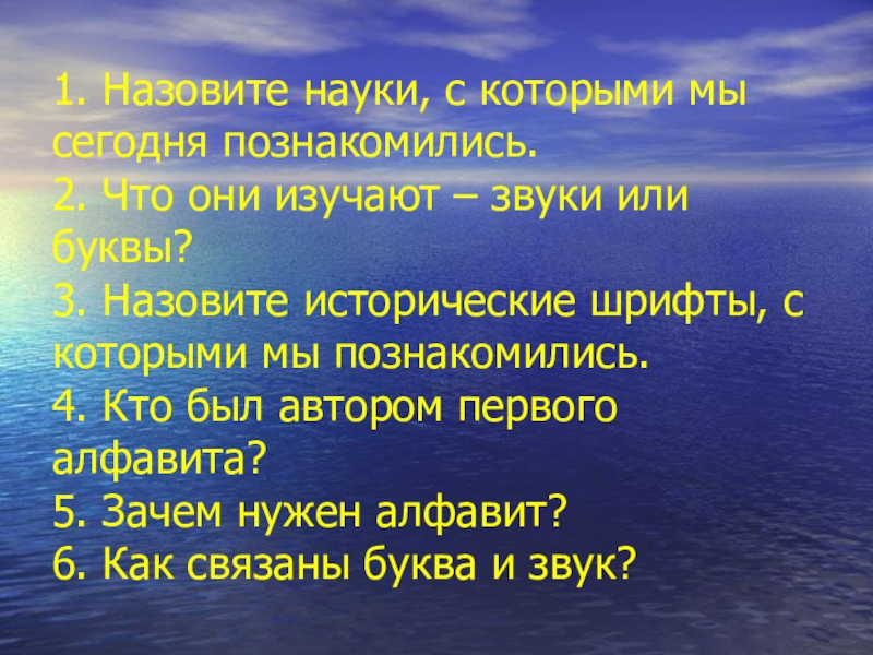– звуки или буквы? 3. Назовите исторические шрифты, с которыми мы познакомились. 4. Кто был автором первого алфавита? 5. Зачем нужен алфавит? 6. Как связаны буква и звук?