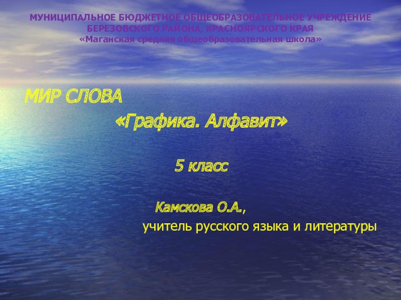 МУНИЦИПАЛЬНОЕ БЮДЖЕТНОЕ ОБЩЕОБРАЗОВАТЕЛЬНОЕ УЧРЕЖДЕНИЕ БЕРЕЗОВСКОГО РАЙОНА, КРАСНОЯРСКОГО КРАЯ «Маганская средняя общеобразовательная школа» МИР СЛОВА«Графика. Алфавит» 5 классКамскова О.А.,учитель