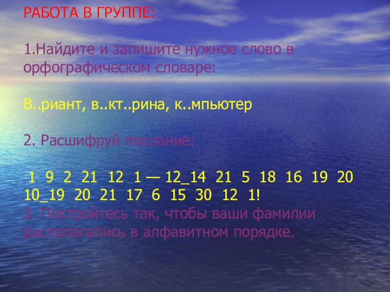 к..мпьютер 2. Расшифруй послание: 1 9 2 21 12 1 — 12_14 21 5 18 16 19 20 10_19 20 21 17 6 15 30 12 1! 3. Постройтесь так, чтобы ваши фамилии располагались в алфавитном порядке.