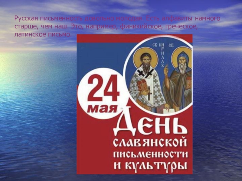 Слайд 25Русская письменность довольно молодая. Есть алфавиты намного старше, чем наш. Это,