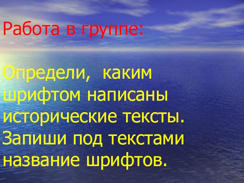 Слайд 11 Работа в группе: Определи, каким шрифтом написаны исторические тексты. Запиши под текстами название