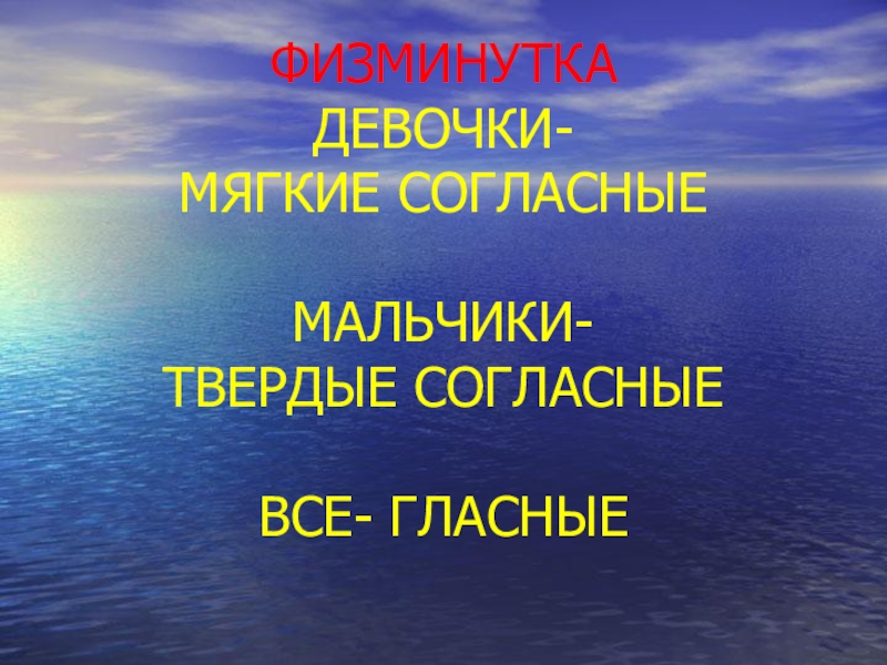 Слайд 14 ФИЗМИНУТКА ДЕВОЧКИ- МЯГКИЕ СОГЛАСНЫЕ МАЛЬЧИКИ- ТВЕРДЫЕ СОГЛАСНЫЕ ВСЕ- ГЛАСНЫЕ