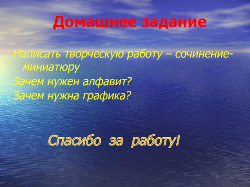 Домашнее заданиеНаписать творческую работу – сочинение-миниатюру Зачем нужен алфавит?Зачем нужна графика?