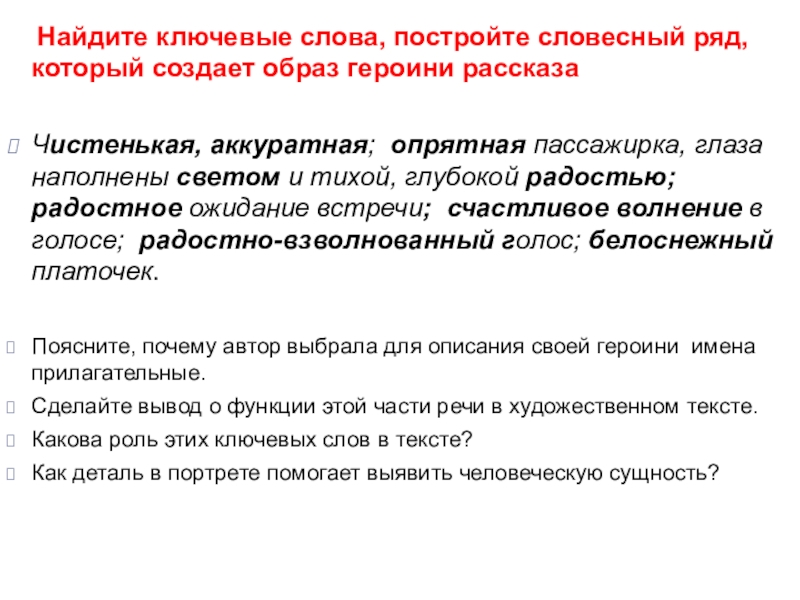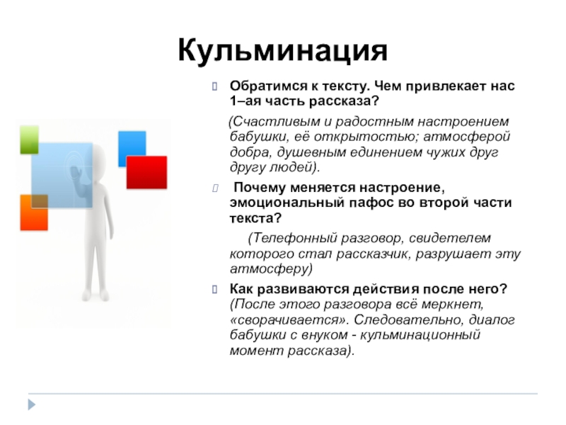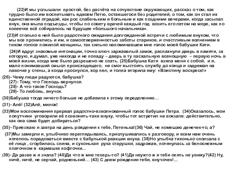 (37)Мы замерли и, улыбчиво переглядываясь, прислушивались к разговору, и всем нам очень хотелось порадоваться вместе с бабулькой реакции внука. (38)Но улыбка тихонько сползала с её лица , сгорбилась спина, и сухонькая рука старушки, задрожав, потянулась за белоснежным платочком в кармашке кофточки...