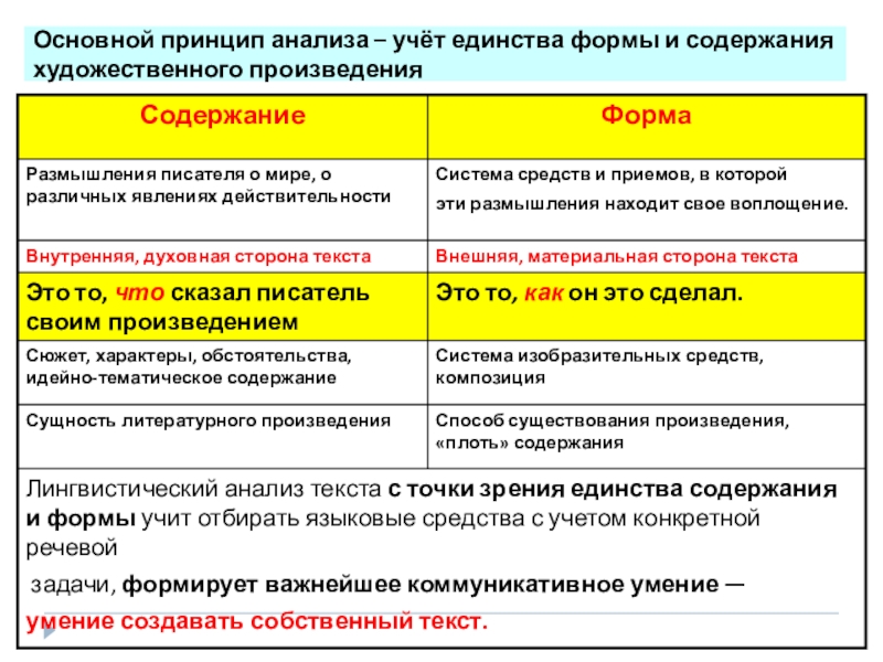 Слайд 12Основной принцип анализа – учёт единства формы и содержания художественного произведения