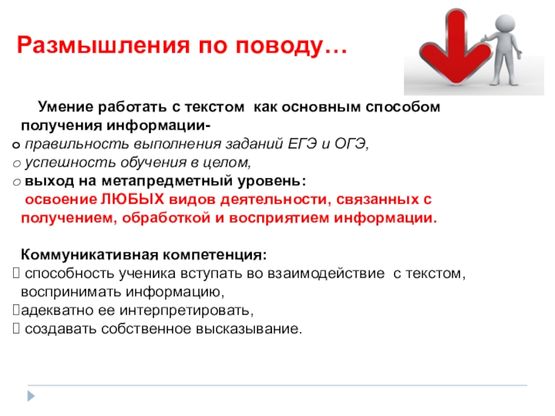 Слайд 2 Умение работать с текстом как основным способом получения информации-
