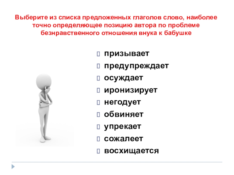 Слайд 74Выберите из списка предложенных глаголов слово, наиболее точно определяющее позицию автора
