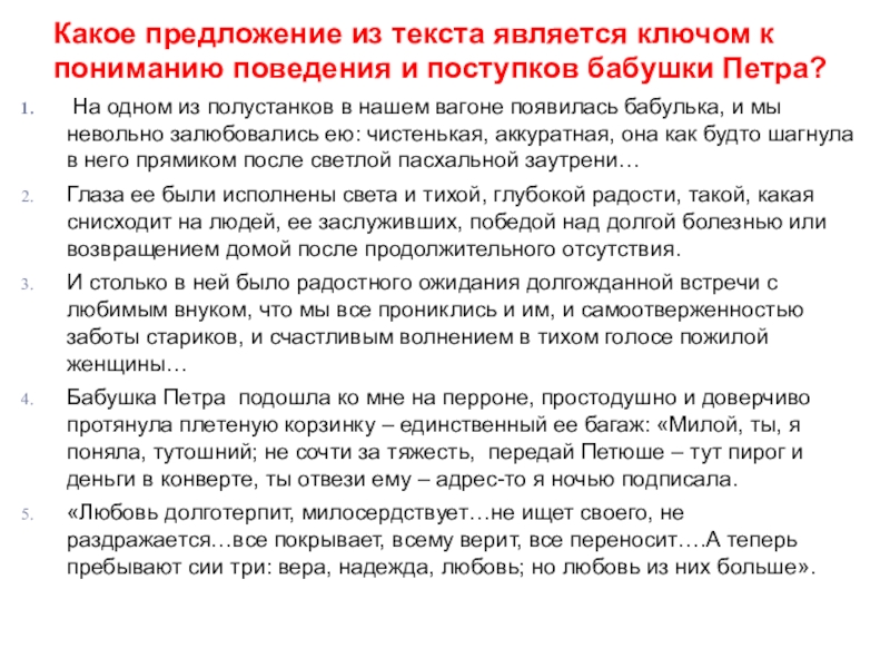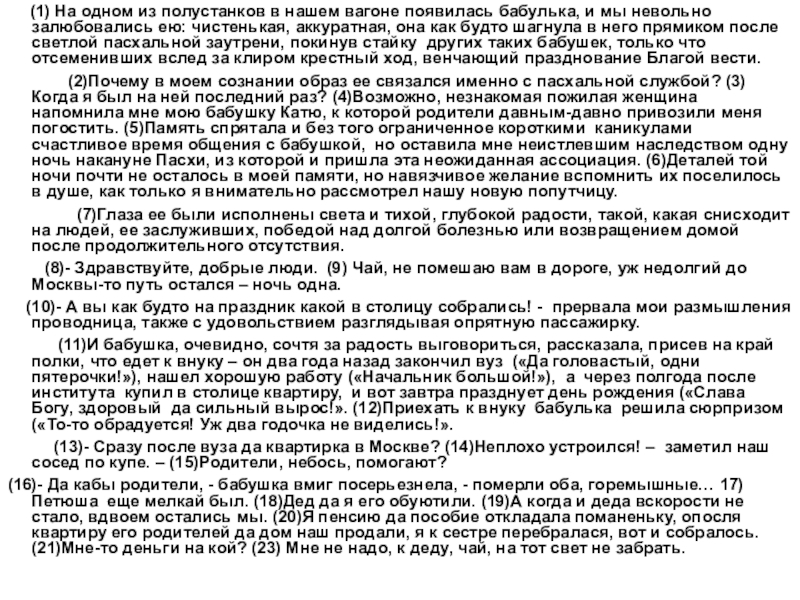 (2)Почему в моем сознании образ ее связался именно с пасхальной службой? (3) Когда я был на ней последний раз? (4)Возможно, незнакомая пожилая женщина напомнила мне мою бабушку Катю, к которой родители давным-давно привозили меня погостить. (5)Память спрятала и без того ограниченное короткими каникулами счастливое время общения с бабушкой, но оставила мне неистлевшим наследством одну ночь накануне Пасхи, из которой и пришла эта неожиданная ассоциация. (6)Деталей той ночи почти не осталось в моей памяти, но навязчивое желание вспомнить их поселилось в душе, как только я внимательно рассмотрел нашу новую попутчицу.