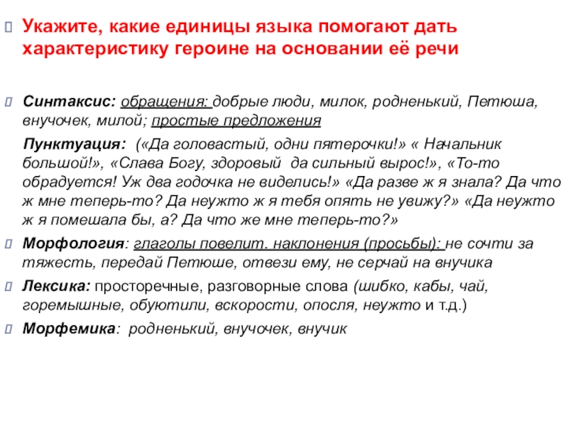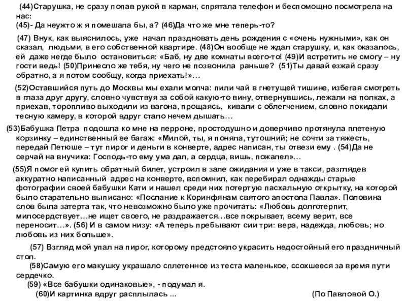 (16)- Да кабы родители, - бабушка вмиг посерьезнела, - померли оба, горемышные… 17)Петюша еще мелкай был. (18)Дед да я его обуютили. (19)А когда и деда вскорости не стало, вдвоем остались мы. (20)Я пенсию да пособие откладала поманеньку, опосля квартиру его родителей да дом наш продали, я к сестре перебралася, вот и собралось. (21)Мне-то деньги на кой? (23) Мне не надо, к деду, чай, на тот свет не забрать.