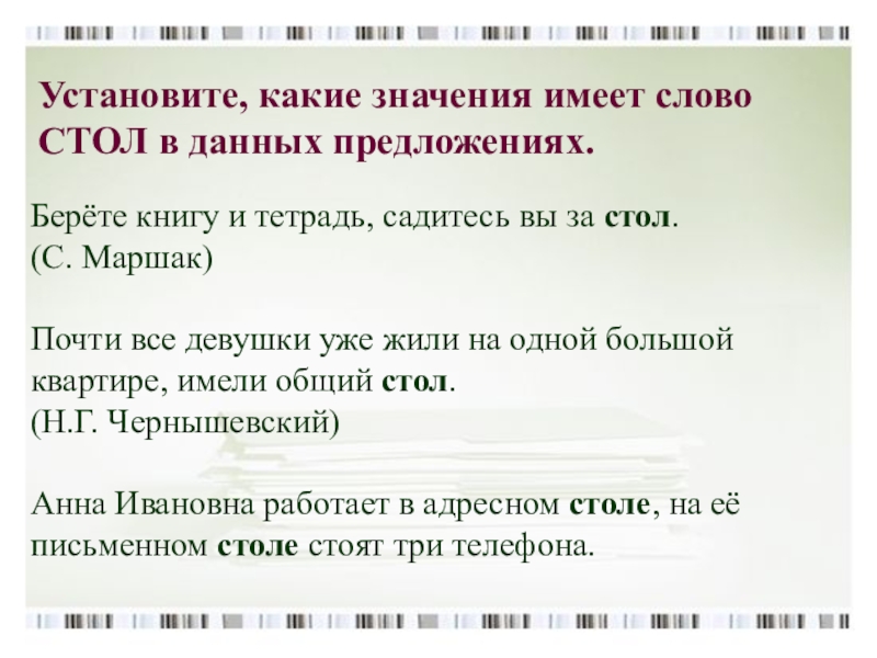 Установите, какие значения имеет слово СТОЛ в данных предложениях.