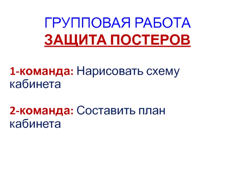 ГРУППОВАЯ РАБОТА ЗАЩИТА ПОСТЕРОВ 1-команда: Нарисовать схему кабинета2-команда: Составить план кабинета